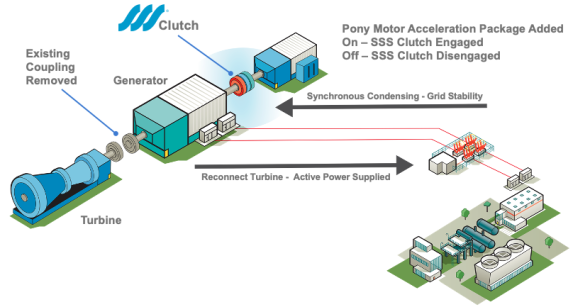 もうひとつの方法としては、タービンを切り離し、SSSクラッチ付きのポニーモーターを取り付けて発電機を運転速度まで加速させる方法があります。この場合、タービンは必要に応じて季節ごとに機械的に再接続することが可能です。